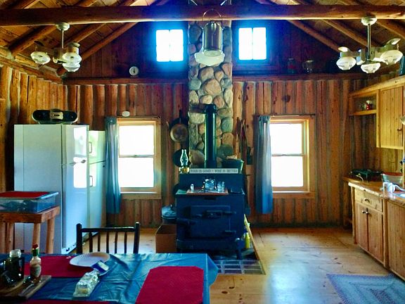 Real stone wood fireplaceLakeside sunroomTraditional wood saunaPine floorsHistoric off-grid log lodgeAttached custom dog kennelsLarge kitchen
