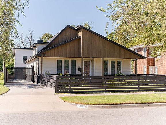 Designed with ease and comfort in mind, this single-level home is perfect for those seeking a forever home in the heart of the city. Step inside to a spacious living room with cathedral ceiling guaranteed to wow your guests, an electric fireplace, and tile floors throughout. The thoughtfully designed kitchen features an island with quartz countertops and room for seating, stainless steel appliances, gas cooktop, coffee bar, and a walk-in pantry. The dining area creates a spacious setting for gatherings, holidays, or casual entertaining. The primary suite has a spacious walk-in closet and provides a private ensuite bathroom with a walk-in shower, soaking tub, private toilet room, and dual vanities. There are two additional bedrooms, each with their own bathroom and walk-in closet. The office overlooks the front garden, while the backroom provides more privacy overlooking the backyard, with a cozy gas fireplace offers additional space for hobbies, reading. The sellers have taken steps to ensure convenience and less maintenance, by equipping the home with a whole-home Generac generator (includes a transferable 10-year warranty), electric gate, sprinkler system, and leaf-guard gutters. Outdoors, the fenced backyard is your private oasis with a pool, open patio, and a StruXure motorized pergola with lights, fans, electricity, and speaker hookups. The detached two-car garage also features a fully equipped studio apartment or bonus game room with kitchenette, bath, laundry hookups, and closets—ideal for long-term guests, a caregiver, or supplemental income. Located minutes from Downtown OKC, the Plaza District, Uptown 23rd, and major highways, you’ll enjoy easy access to dining, entertainment, and healthcare, all while living in a vibrant, growing historic neighborhood.