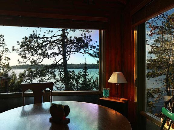 Secluded Yr Round Lake Vermilion Log Retreat At Waters Edge W/Sand Beach--1036 SF RETREAT, Private Cove On 500 Ft Shoreline & 3 Acres--Panoramic Faraway Views W/Opposite Shoreline State Land, No Views Of Other Cabin Lights At Night--Towering Pines & Rock Outcroppings, Short Boat Ride Across Calm Water To Landing Or Great Snowmobile Access! 690 SF, 2BR main cabin + 346 SF guest/sauna cabin at beach. Log main cabin w/vaulted ceiling, lg windows showcasing view, full glass doors to huge lakefront deck, Jotul fireplace-front wood stove, kitchen w/modern & vintage appliances, gas lights plus electricity. Metal roofs, utility & wood sheds, 2 docks. Property has outhouse but is approved for septic system. Walking trails throughout, lots of blueberries. Take a break from everyday life & watch eagles, catch fish, start the woodstove & watch the snow fall, enjoy magnificent sunsets from your wonderful relaxing nest!