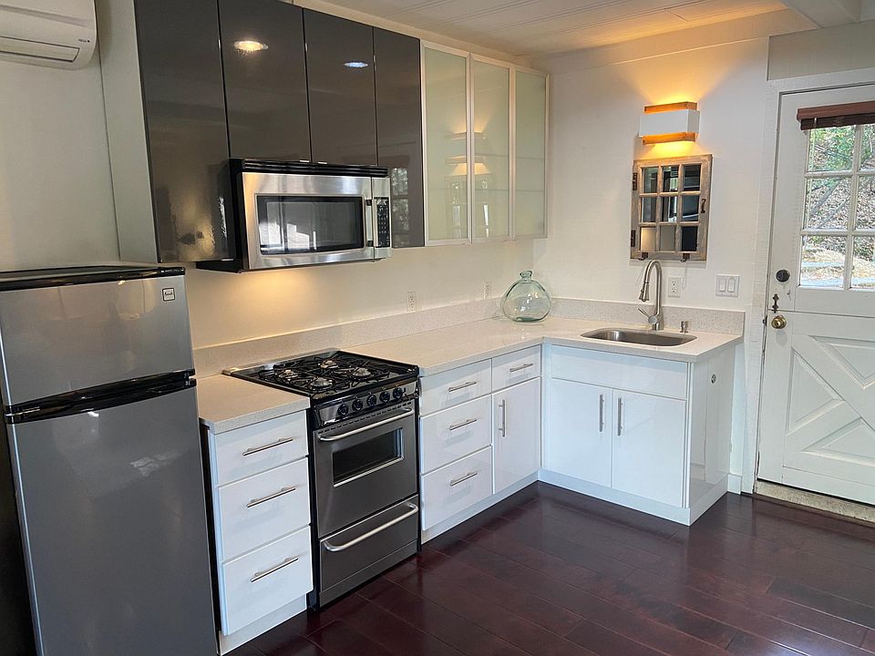 Private, stand alone, fully furnished Mid-Century modern studio in Orinda, near Orinda Country Club, Lake Cascade, downtown shopping and restaurants. Bright and spacious detached guest house with private entrance, updated kitchen and hardwood floor. Includes use of dry sauna. This guest house is located on a 1 acre oak-studded estate, overlooking the natural hillside and creek.