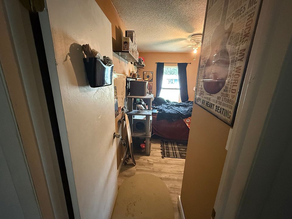 This newly renovated room has new luxury vinyl plank flooring, modern-looking trim and an earthy paint color. It is right across the hall from the bathroom. There is a window on the front side of the house for natural light and a small closet with a storage shelf. All of the shared spaces have tile for the floor, including the hallway, kitchen, laundry room, living room, and shared bathroom.