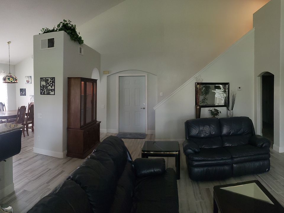 Townhouse apartment, fully furnished with all utilities included. 3 bedrooms 1 1/2 baths, open concept kitchen, dining, living room with high vaulted ceilings and tons of natural light. large breakfast bar, lanai, outside patio, back yard, driveway parking for 1 or 2 cars, gated community, with pool and fitness center,