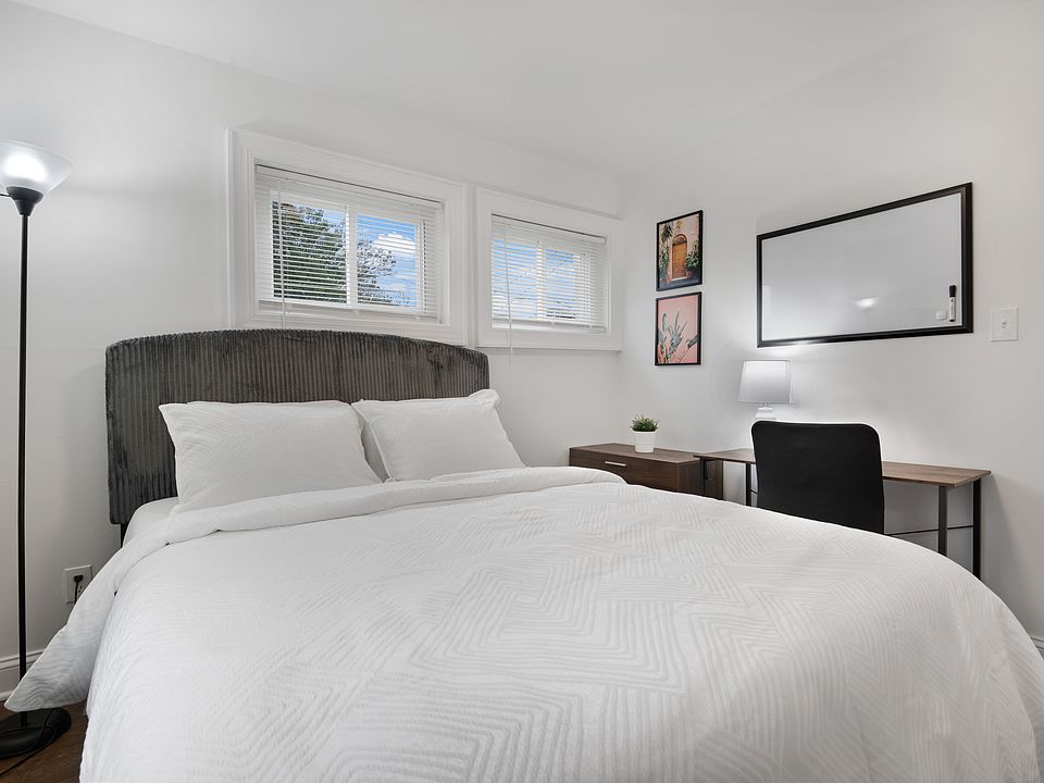 The available bedroom is completely furnished with a queen bed, a dedicated workstation (table, chairs), a dresser, and a lamp. The rest of the home is also completely furnished with a living area, dining area, TV, sofas, kitchen, and laundry/dryer unit (in the basement). There is also a backyard and a front yard. The rest of the house is also rented out to working professionals.