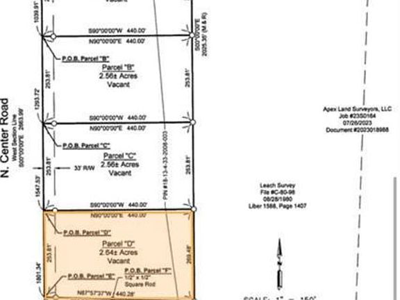 NEW BEGINNING ON NORTH CENTER! This is your opportunity to build the home of your dreams on this newly split 2.64 acre parcel of land in the heart of Kochville Township with city water at the road. This rural location offers a country feel but only minutes from the MBS International Airport as well as several restaurants and retail shops. This newly split PARCEL D will be recorded at closing. Also, the seller has obtained a transferable septic permit with acceptable requirements for an elevated septic field. The natural flow of water from the adjacent farm field drains toward the property. The survey for the lot lines legal description will be recorded at closing. Request a copy of the survey for details.
