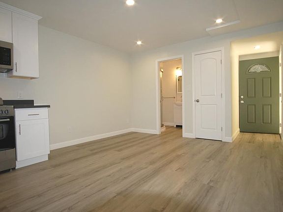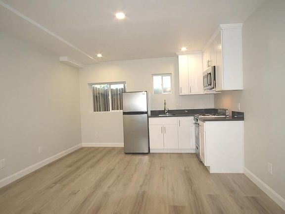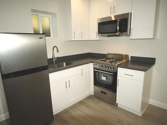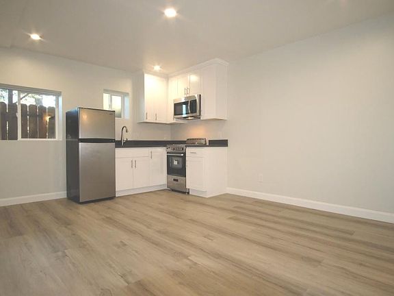 Offered is a small studio apartment. Remodeled kitchen with quartz counters, quality wood cabinetry, stainless steel electric range, and built-in microwave. Wood laminate flooring and recessed lighting throughout.