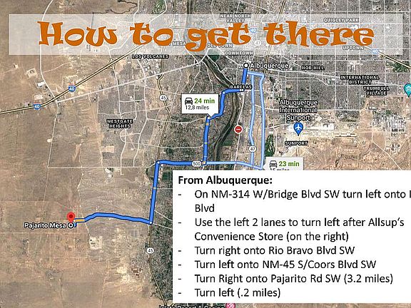 Pajarito Mesa, Albuquerque, NM, is a place anyone would be happy to call home. Schools, shopping, entertainment… everything is located within a few minutes. Downtown ABQ, NM, is only a 25 minutes drive. This 1.25 acre vacant property is settled close to Pajarito Rd SW (dirt road). The area boasts endless fun activities for the whole family and offer all the city amenities and benefits one may need. Get out of the city rat race and into the country! According to County the lot has legal access via a dirt road heading to Pajarito Rd SW. The area is “hot” right now! Albuquerque seems getting “closer” all the time. Property Summary Approx 1.25 acres, which would make the perfect building lots. This lot has building potential for a dream home! We are offering these properties at a discounted ROCK BOTTOM cash price so that one lucky buyer can own the perfect property at a BELOW MARKET price. Property Value: The Market Value by County is $11,600. We offer the property for only $3,900 if you pay in full. That saves more than 60% or $7,000!! We are also offering this property with a very affordable, no credit check seller financing. We love to work with buyers to help ensure the best deal that suits any budgeting needs. Address/Location: Pajarito Rd SW, Albuquerque, NM County: Bernalillo County State: New Mexico Parcel Numbers: 100705104818930189 Parcel Size: approx. 1.25 acres Road Access: dirt Power: at Pajarito Rd Water: would be by well or tank Sewer/ Septic: would be by septic HOA: no Annual Property Taxes: $140.94 (2020) Owner Financing for Everyone! No Credit Check! No Banks! No Penalty for Early Payoff! Purchase Options: We are currently offering 2 ways to buy this beautiful property: Seller Financed Price: $3,900. Purchase this property today with only $199 down and payments of just $121.69 (interest rate and annual taxes already included) monthly with 5 years term length. This is a fully amortized loan at 13.90% interest with NO CREDIT CHECK or prepayment penalty. Lower interest rate and possibly a lower monthly payment are available with a larger down payment. Ask us for more details and we will work with you to create the terms and monthly payment that work with YOUR budget! Cash Price: $3,900. Disclaimer Any questions of what you can or cannot build, can or cannot do on the property should be directed to the county Planning and Zoning Department. Everything I know about the property is listed here. The information provided is deemed reliable but not guaranteed. Please do your own due diligence. All property is sold as-is, where-is.