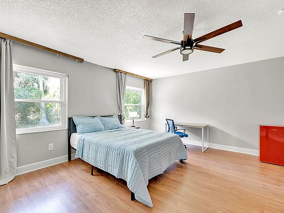 Step into a cozy and inviting extra-large bedroom featuring a comfortable foam mattress and a large reach-in closet for all your storage needs. Enjoy a cool breeze from the ceiling fan while you work at the convenient workspace, complete with a stylish lam