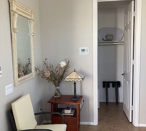 Lovely & private 1bedroom, 1 bath, detached CASITA with mountain views in Palm Desert. Fully furnished, with a comfortable queen size bed, walk-in closet with clothing rack & cabinet with shelves and drawers. The walk-in closet is 6' x 4'5". The en-suite bathroom has a walk-in shower. Lots of windows provide natural light, but all have shutters that can close for privacy. Separate entrance with French doors, and a large private patio with table and chairs. Amenities include a flat screen TV, microwave oven, Keurig coffee machine & pods, tableware, iron & ironing board, vacuum, laundry basket, luggage rack, tables, chairs, lamps, overhead fan light, adjustable AC/Heating and a small refrigerator. FREE utilities, Wi-Fi and cable with premium movie channels. The casita has NO kitchen or washer/dryer. Located within a safe and quiet gated community. Close to restaurants, markets, shops, drugstores and Freedom Park. Short drive to the 10 Fwy and Acrisure Arena, and not far from El Paseo, Rancho Mirage and Palm Springs. If you'd like to schedule a showing, please provide the best number to reach you.