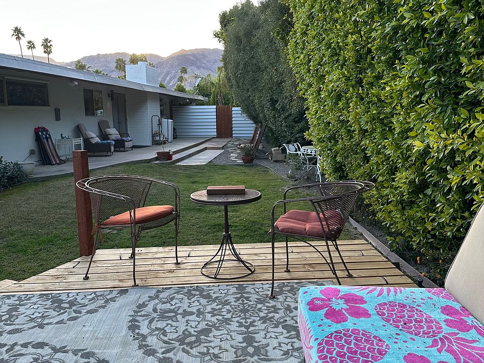 Welcome to this 70 year old modern home in the heart of El Paseo adjacent to Shadow Mtn Golf Course and its miniature putting course, with a game room and dining! This private, completely walled-in, 3 bedroom, 2 bath home has an open floorplan with the great room offering a fireplace, formal dining, bar area, guest bath, views of the pool and mountains, from the East/ South/West. The master bedroom has a large full wall length closet, with a private entrance on one side of the house has direct access to the pool, spa and deck. The other two bedrooms are generously sized have a large full width wall closet with plenty of closet space share a hallway bathroom. The large kitchen has a dining area with a closet pantry, direct access to the open concept living room; and laundry room and a potential two car garage. The outside has an expansive awning, south facing pool, spa and BBQ/island, perfect for entertainment. The backyard is private with an extensive deck for added entertainment. For added money the townhome studio casita next door could possibly be rented as a separate (granny/studio) suite.