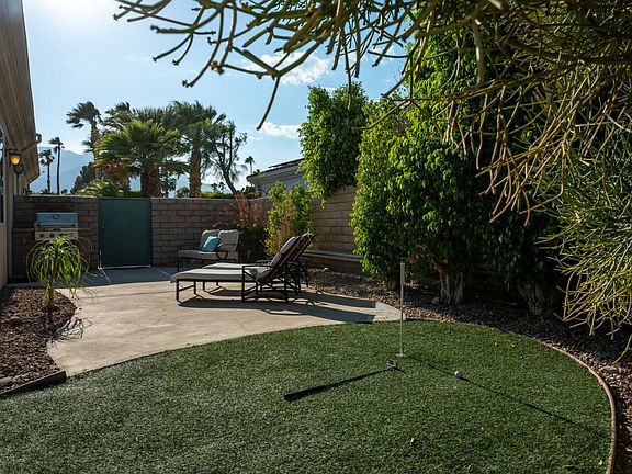 At the center of the home is a beautiful courtyard-style backyard with a sparkling pool and spa, accessible from multiple rooms for easy indoor-outdoor living. Step out from the kitchen to the BBQ area with a stainless steel grill and additional seating. Soak up the sun on one of the many lounge chairs, gather around the outdoor fireplace in the evening, or share a meal under the stars at the outdoor dining table for eight. For daytime fun, guests can enjoy a professional-grade ping pong table and a putting green.