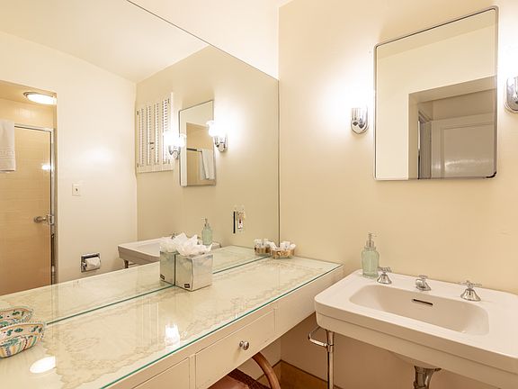 Come enjoy gorgeous views, history, charm, and Hollywood celebrity intrigue while staying at this magnificent gem in Palm Springs. An original John Porter Clark (1940) architectural home nestled in the foothills overlooking the city, this retreat is located in the exclusive and secluded 'Little Tuscany Estates' neighborhood. Built for John and Fannie Hamrick, this historic masterpiece will transport you to the glamorous golden era of Palm Springs yesteryear. Make your way outside through the living area and you will be greeted by a sparkling private pool and sweeping views of the mountains beyond. Don't worry about mealtimes, as a gas grill awaits for a cookout in the sunshine and a fully equipped kitchen awaits inside to whip up any recipe with ease. When it is time to head inside for the night, the wet bar will be ready for guests to make favorite cocktails and the spacious great room features a large sectional couch, vintage art, a 47' HDTV, and a large wood-burning fireplace to complete this inviting space.