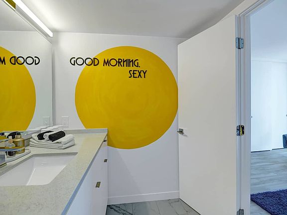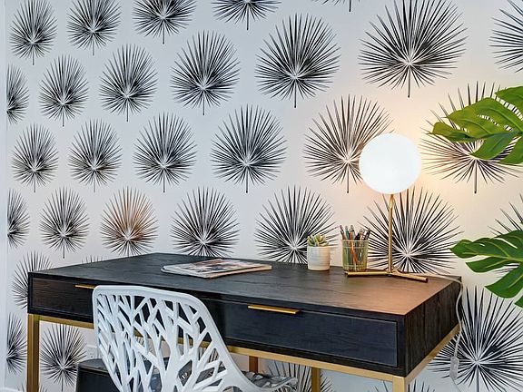 The open floor plan features large, beautiful, picture windows and doors perfect to soak up the desert scene. The appliances and interior finishes match the polished vibe of the home: quartz countertops, stainless steel appliances, and frameless contemporary cabinetry. An electric fireplace sets the mood for cozy evenings. Around the corner, an office area transforms effortlessly into a bedroom, complete with a cleverly concealed, endlessly comfortable Murphy bed.
