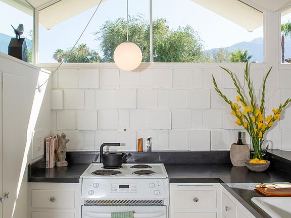Stay inside an exclusive modernist-design-loving community that is one of the finest examples of desert modern architecture in Palm Springs. The rare and very special folded plate roof, shadow block and drop pendant globe lights are original to the house. Designated as a Class One historic site, this home is perfect for a creative couple or family who appreciates architecture and wants to work from home or vacation in paradise.