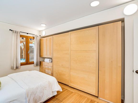 Enjoy elegant interiors featuring pegged oak floors, a cozy fireplace, built-in cabinetry, and abundant natural light. The remodeled kitchen is a culinary dream boasting birch cabinetry, quartz counters, terrazzo flooring, and premium appliances. The bathroom offers luxurious comfort with heated tile floors and frameless glass.