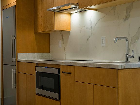 Contemporary styleFull kitchenWolf induction cooktopSleek interiorBuilt-in linen closetToto wall-hung toiletGlass shower enclosure