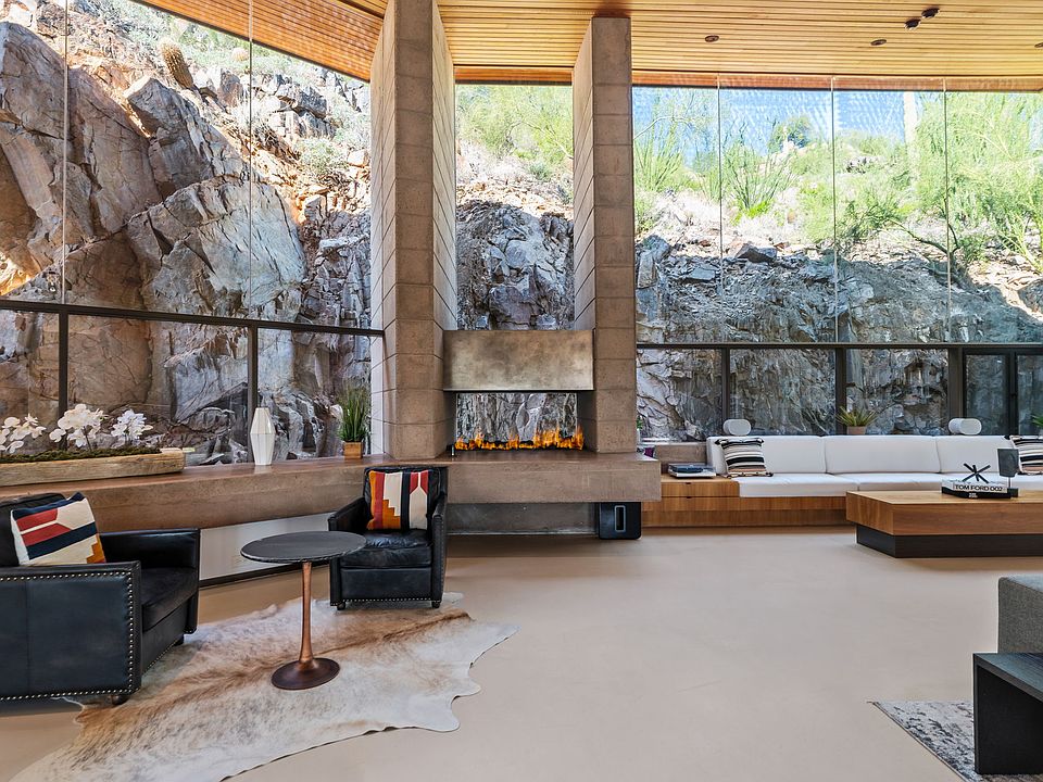 This architectural masterpiece seamlessly blends into the natural mountainside showcasing dramatic floor-to-ceiling windows that frame the natural rock formations beyond, creating seamless indoor-outdoor integration with warm wood beam ceilings throughout.