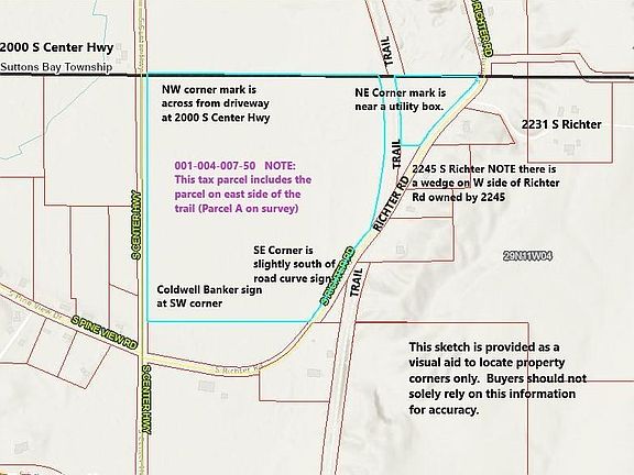 No photos available to confirm: sources repeatedly report the presence of abundant wildlife including bear and deer here and in the nearby neighborhood. Buyers are encouraged to perform their own due diligence in all regards. This is an interesting piece of property having been owned by the same family for generations. With over 1600' on Center Hwy and over 1,000' on S Richter Road, the Leelanau Recreational Trail crosses the NE corner. Mostly wooded, older trails need a little clearing! A flowing stream is easily seen along Center Hwy, and another creek meanders the wooded interior.