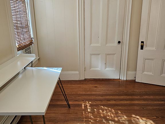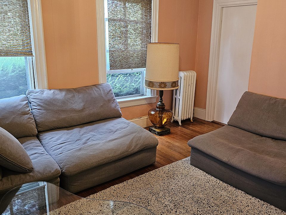 2 bedroom apartment on the first floor of a house located on a small, quiet property on Pidge Avenue in Pawtucket. The apartment features a large living room with build-in book shelves. A large, bright bedroom with bay windows and a closet, and a second bedroom. All rooms have hardwood floors as pictured. A large kitchen equipped with built-in cabinets, an island, a new fridge and stove. The bathroom has a reglazed porcelan tub. Ceiling fans in all rooms. Washer and dryer in the basement of the building. Some furniture can be provided if needed. Parking is on the street. Small pets negotiable. Tenant pays gas and electic.