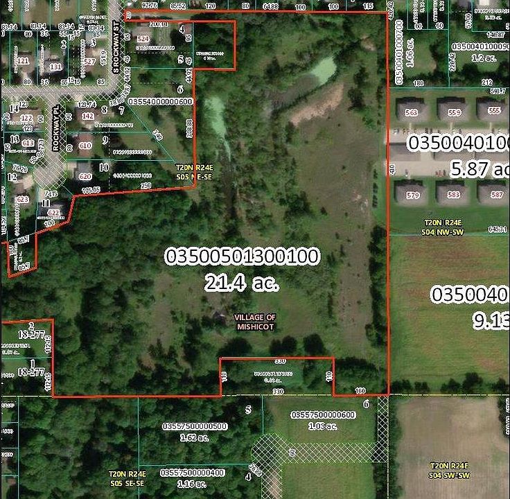21.40 Residential Zoned Parcel of land located in the Village limits of Mishicot. Site is buildable and Seller will help with the driveway access into the buildable area. A 2 acre pond is also part of the property. Currently used as recreational land with hunting allowed with bow and arrow. Comprised of woods and open acreage provides plenty of privacy yet located right in the Village.