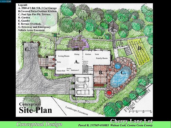 NEW lot approved 2024! 1/2 acre plus FLAT.Previously a tennis court. Private setting. Walk to BART. Looking at the left side behind treeline is a swale which was a creek. The county rerouted drainage and now a usable area. See "Conceptual House Site Plan".Sewer main easement also on left side runs to rear of property. See easement map. Buyer is aware the property requires Conditions of Approval be satisfied prior to receiving a building permit. Property next to 2966 Cherry Lane.