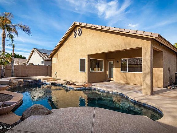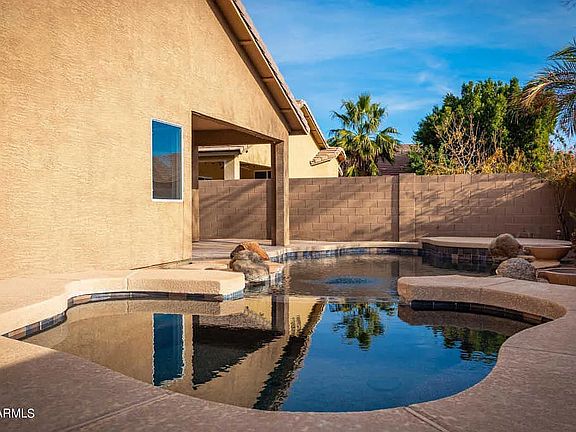 Step into your private backyard oasis featuring a sparkling pool and relaxing spa, ideal for year-round enjoyment, entertaining, and unwinding under the Arizona sun.