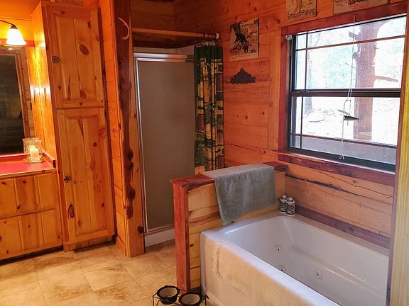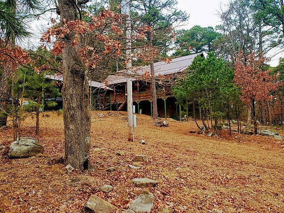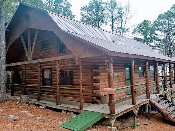 This is a beautiful one story Satterwhite D log cabin with a loft and carport overlooking the well known trophy bass tournament Corp of Engineers Lake Sardis. It also includes an adorable detached bunkhouse that sleeps four. This could be used as guest house or extra rental income. Main cabin is 1,376 square feet of living space not including a stunning 936 square foot of a wrap around covered porch. Large under porch secured storage with a solid foundation. This quality built cabin was built in 2012. Bunkhouse has no refrigerator bfut could easily accomodate one, and was built in 2017. This bunkhouse is 14ft. by 20 ft. with covered porch that is 5 ft. by 20 ft. and includes a 3/4 bath. Development has covenants and restrictions but are reasonable and protect your equity.This property includes tree and rock features as well as a seasonal creek water feature running down the west side of the property. All contents of home except dining table and personal effects are negotiable. Great development and neighbors. Property does have a 30 ft. road easement going up flagpole hill to a phase 2 development. Taxes are $1,344 annually and is located four tenths of a mile west of the Sardis Lake dam on highway 43 in Rocky Mountain Estates and is lot 4 of Phase 1