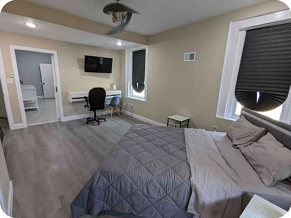 This is a private suite with access off Kitchen. It has a fully furnished room with a king size bed, and a television., all utilities are included.