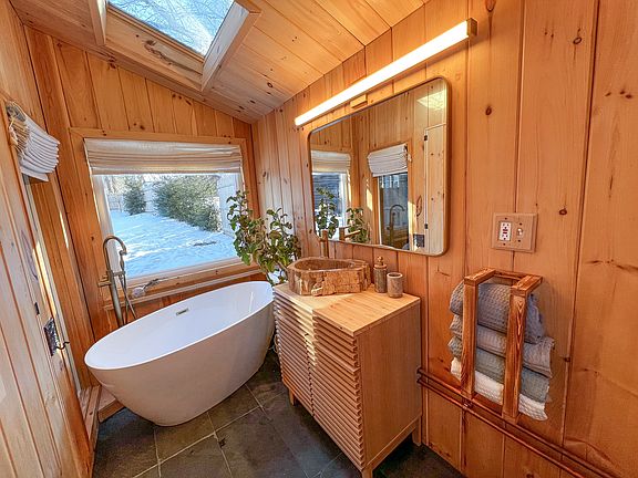 Magazine-featured modern bathroomQuaint private roadSoaking tubHeated slate flooring