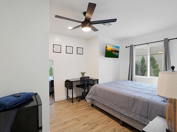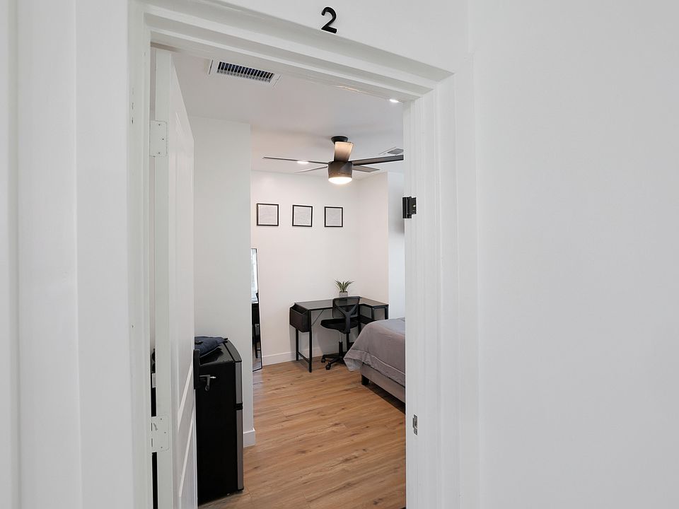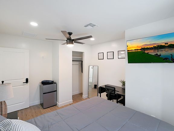 Large with Queen size bed linens included, equipped with Smart TV, Desk with chair, mini fridge with freezer, night stands & outlets with usb/C charging ports. Reach in closet. Security door lock placed inside each room for extra comfort and security