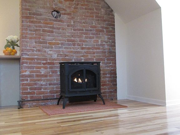 This unique apartment spans three floors of a big old house that sits high off the street. There are lots of steps! The main living area on the third floor has a 12.5-foot ceiling, ceiling fan, recessed lights, hardwood floor, exposed brick chimney, five operable windows, and a freestanding gas fireplace. The kitchen, also on the third floor, features a large center island, stainless steel dishwasher, gas range, and counter-depth refrigerator with bottom freezer.