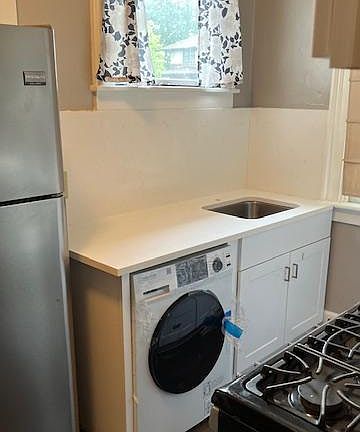 In unit laundryWhite kitchen cabinetsQuartz countersStainless steel appliancesStainless appliancesWhite shaker cabinetsNew quartz counters