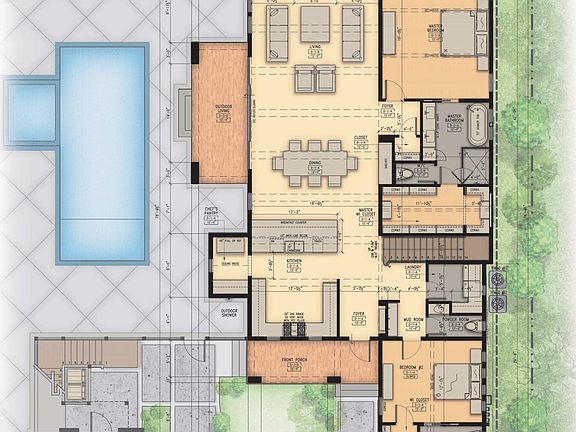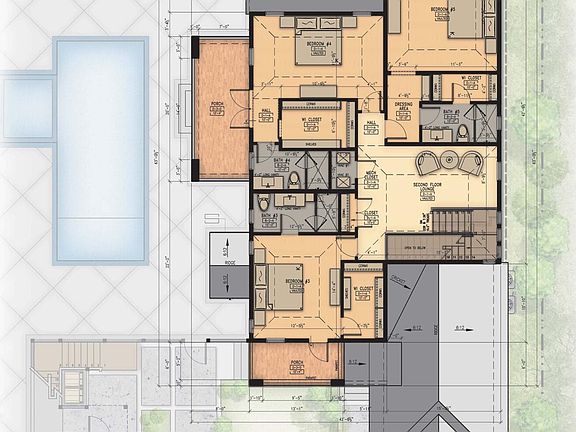 The primary suite provides a serene first-floor retreat, with a freestanding soaking tub, dual vanities, an oversized walk-in shower, a substantial custom-fitted closet, and direct access to the covered porch and pool terrace, creating an effortless indoor-outdoor connection. A second bedroom on the first floor serves as an ideal guest suite with its own private bath.