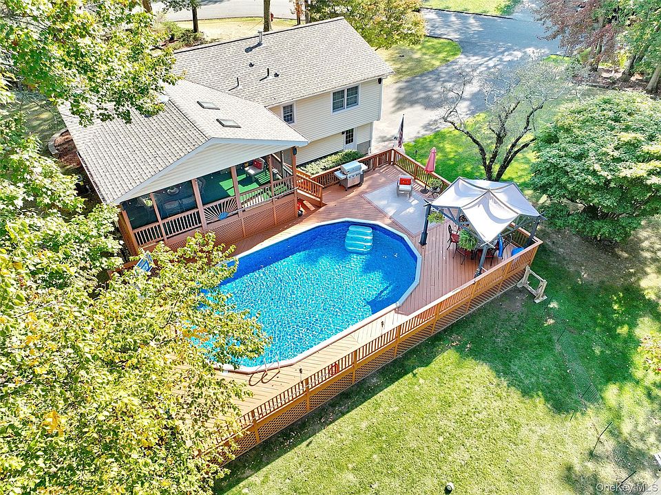Pomona! Wow! Move right into this beautifully maintained and updated 4-bedroom, 2.5-bath bi-level situated on a picturesque corner property. Enjoy a fabulous cherrywood kitchen featuring granite counters, a custom center island, and a professional-grade Viking range. The enclosed three-season room with soaring ceilings overlooks a private backyard with an above-ground pool set on a spacious deck—perfect for relaxing or entertaining. Additional highlights include ample closet space, a two-car garage, a storage shed, LOW taxes, and more!