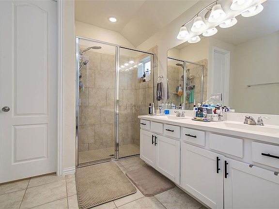 Large primary suite with French doors, dual vanities, walk-in shower & closet