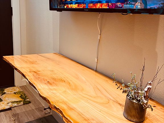 The kitchen includes a handcrafted live edge wood dining table, quartz countertop, a full-sized refrigerator, dishwasher, microwave, dual burner hot plate, and air fryer (no oven), and all the cookware you could need! Time and care have been given to fully stock amenities!