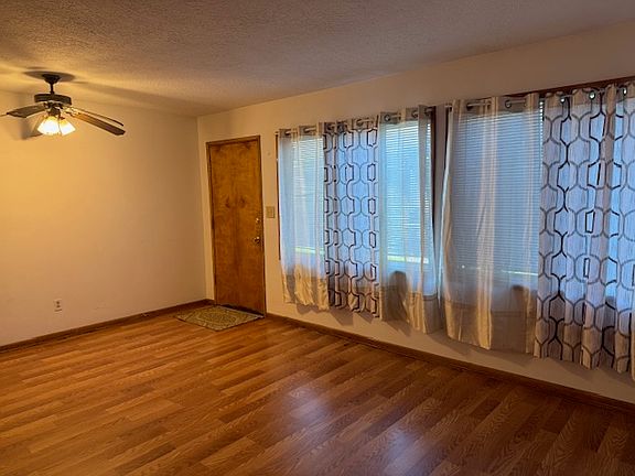 -Living room with ceiling fan, blinds and drapes;