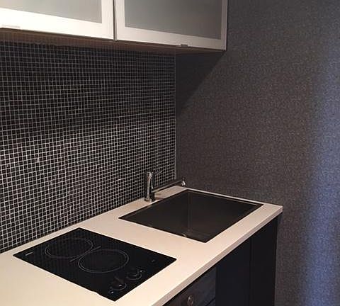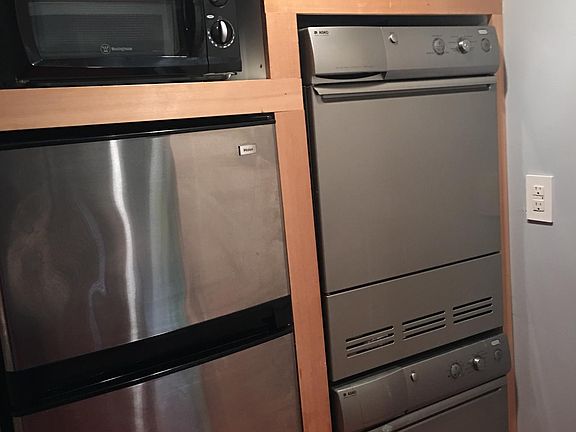 (Carrara marble and Ann Sacks glass tile), underfloor heating, towel warmer. It also includes a new kitchen with marble tile, hemlock ceiling, caesarstone countertop, dishwasher, and private washer and dryer. Both bathroom and kitchen are separated from main living space by a hallway. Suite has a large closet, built-ins, wainscoting, covered porch.