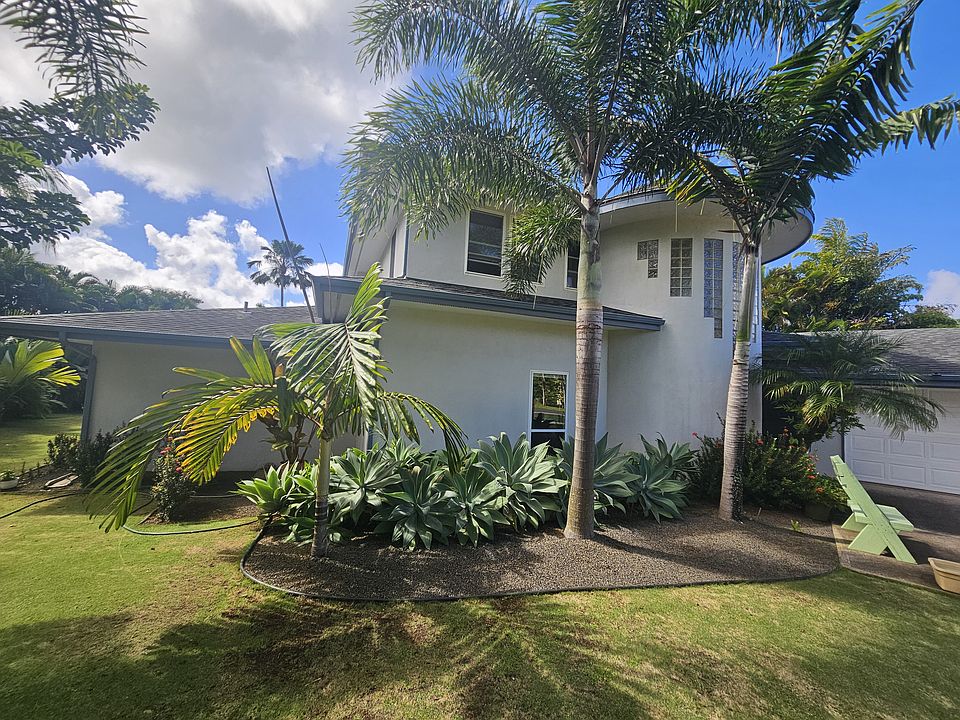 Princeville house 4 bedrooms, 3 full bathrooms. Spacious upstairs master with french doors opening to lanai looking at mountains and sunset. Cal King bed, ensuite bathroom with tiled shower, stand alone tub and double sinks. Huge walk in closet. Large wall mounted tv. Office or kids bedroom with two single beds.