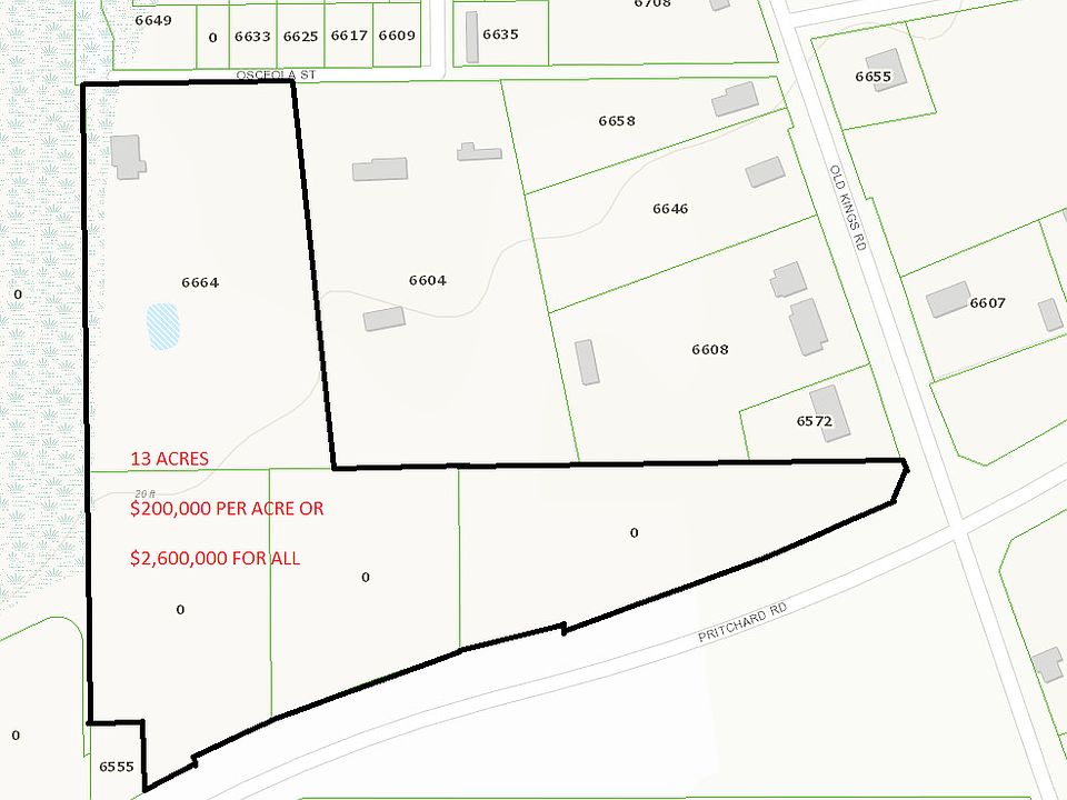 ****13 Acres IL Zoned @ Intersection of Pritchard & Old Kings FOR SALE - 200,000.00/acre**** *13 Acres, Industrial Light Zoned *Within less than 1 mile of I-295 *Approx. 1300 ft. of Pritchard frontage *Area expanding w/ many new businesses *Perfect for a gas station or any other new businesses *$200,000.00 per acre * Acres are outlined in black in the photo