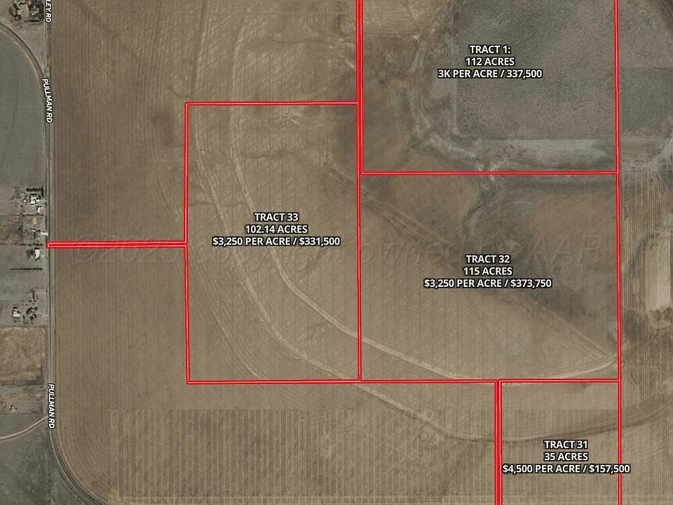 This parcel offers a great opportunity for a large homesite or investment holding. With paved access coming from Pullman Road, this 102.14± acre tract is in a great location with productive soils. The level terrain and high-quality Pullman clay loam provide a solid foundation for agricultural operations, while the location offers potential for future subdivision or development. This tract is unimproved with no deed restrictions, providing a blank slate for agricultural, recreation, or long-term investment use. 2026 winter wheat will be negotiable with the sale. All mineral, wind, and solar rights will convey. Water:
