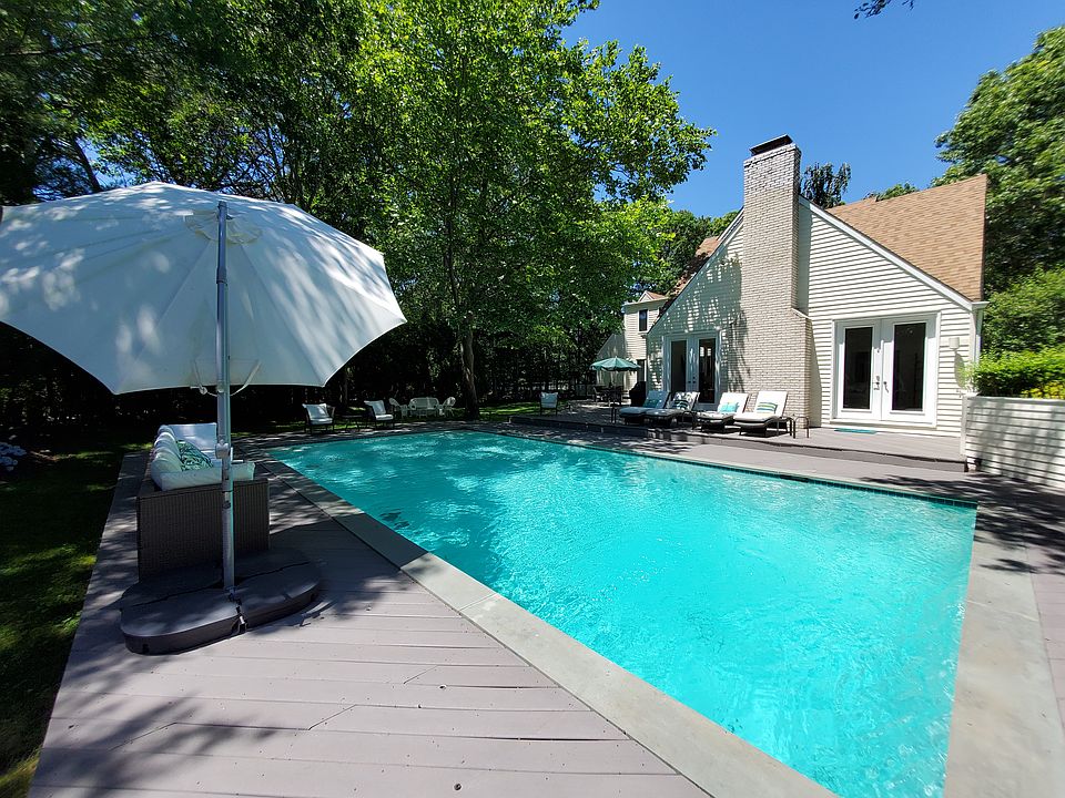 Bright Post Modern home in Quogue with heated pool, spa, tennis, and Quogue Village Beach rights. Located at the end of a quiet cul-de-sac street, the house includes an open living room with dining area and kitchen, four bedrooms, four bathrooms , powder room, and den/office. Outside, enjoy a heated pool, spa, expansive new decking, tennis court, and beautiful, lush landscaping. Just minutes to the Quogue Village Beach, Village of Quogue and the Jitney, everything needed for a perfect summer retreat.