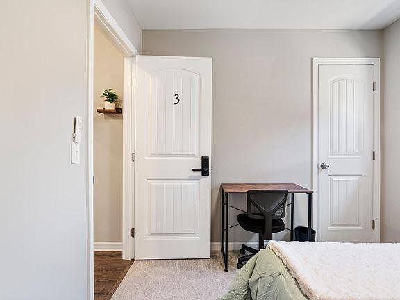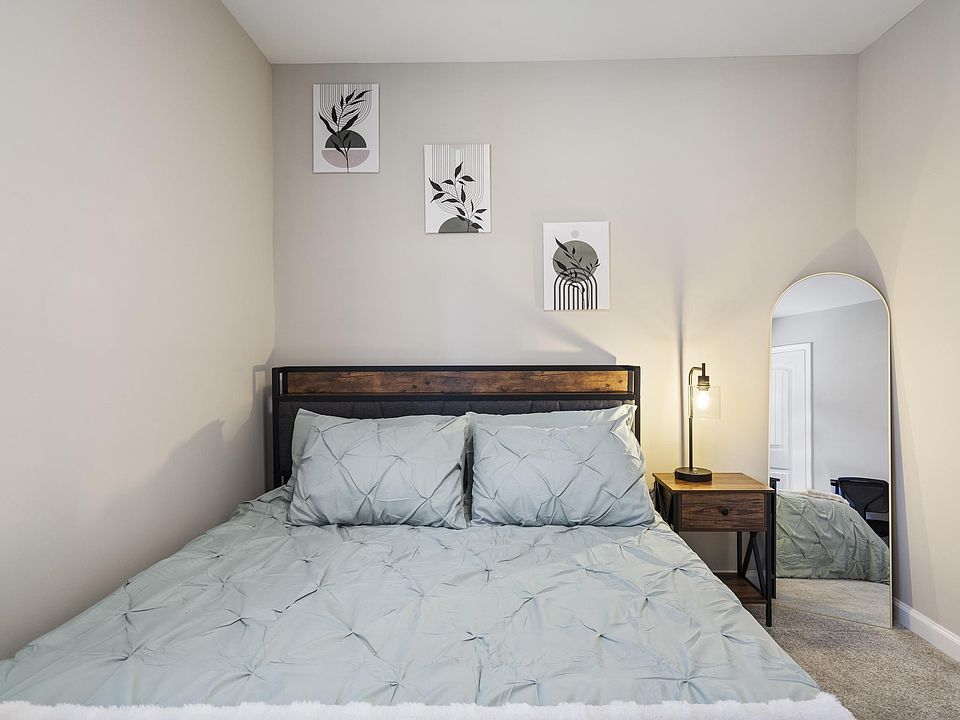 Cozy room (8'x10') with a decent sized closet. Headboard has outlets and charging ports built in. Full length mirror, desk, chair, lamp and night stand available.