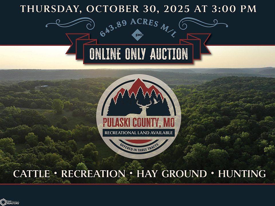 Mark your calendars for October 30th, 2025. Presenting 643.89 acres m/l in Pulaski County, Missouri, to be sold in three individual tracts via Online-Only Auction. Situated just south of Richland, Missouri, with convenient access to Interstate 44, this diverse property offers a rare combination of productive pasture and hay ground, mature timber, Gasconade River frontage, and multiple ponds. Whether you’re seeking a working cattle or hay operation, recreational retreat, hunting paradise, or the perfect rural building site, this property checks every box. Improvements include a brand-new equipment shed, two hay barns, a milk barn, cattle working facilities, and multiple smaller outbuildings, supported by two wells and electric service provided by Laclede Electric Cooperative. In addition, buyers should note that the seller also owns a private executive estate next door. The home was built in 2008, spans over 6,200 square feet, and sits on 140 acres with Gasconade River frontage. While not included in this auction, the property may be available to purchase separately, providing a rare opportunity for buyers interested in a large home already in place. This is a rare opportunity to purchase a diverse farm with income-producing potential, recreational amenities, and scenic building sites. Bidding will be on the individual tracts only.