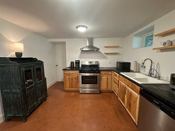 This is a one bedroom walkout apartment with a separate entrance and separate living space on a shared 6 acre property. There is a fire pit and stream with a bridge to cross it on the property. No outdoor storage, there is a small area for storage inside.