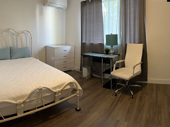 Desirable, safe neighborhood with lots of walkers. Close to Trader Joe's, banks, restaurants, coffee shops and Shasta Mall, Driveway parking convenience and small shed for bike and miscellaneous storage. Garage not included. Beautiful contemporary remodeled home completely FURNISHED down to the linens, kitchenware and everything you need. Washer and dryer in the home. Mini split AC/heat and ceiling fans in each bedroom and living room. New laminate floors, granite kitchen countertops, stainless appliances, all new bathroom, lovely large deck with table and chairs to relax with a morning cup or enjoy the quiet yard. BBQ for your enjoyment. Private and quiet community pool two driveways away open May 1 - October 1. Lease and background check required. $1600 deposit.