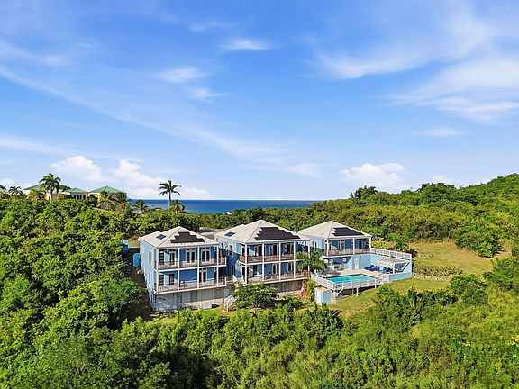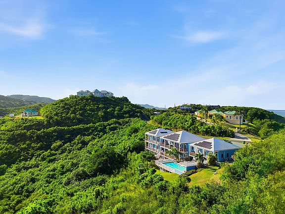 Experience modern island living at its best in this beautifully crafted three-pod, 6 bedroom, 5.5 bath estate with stunning south shore views. Designed for efficiency and comfort, the property features a SOLAR system, a 22kW generator, and a 500-gallon propane tank. With underground utilities, HOA-maintained paved roads, and the property pre-wired for a gate, you'll enjoy both privacy and peace of mind. The estate also offers 64,000 gallons of water storage and UV water filtration, allowing for true self-sufficiency. Spread across three pods and surrounded by Ipe decks and railings--renowned for their weather resistance--this home spans 6,557 sq. ft. of interior space and 3,880 sq. ft. of exterior living areas. Cedar ceilings, Kevlar shutters, and transom windows above the doors add warmth, protection, and natural light. The home sustained no damage during Irma or Maria, a testament to its quality construction through Tilman Construction.