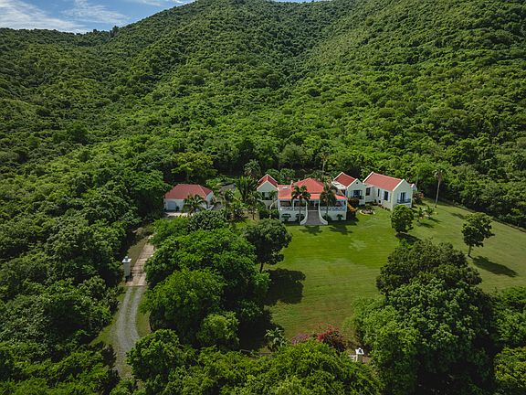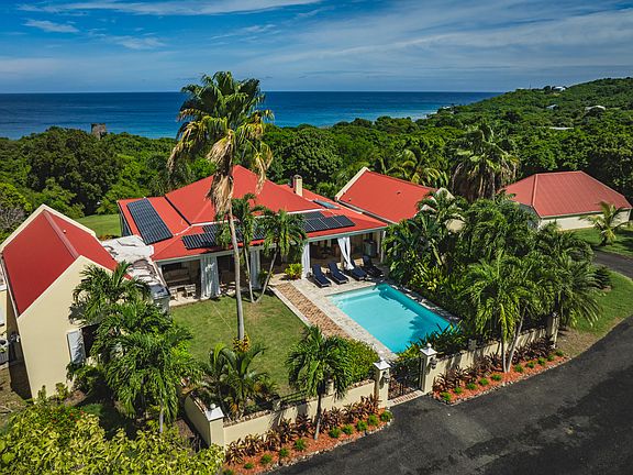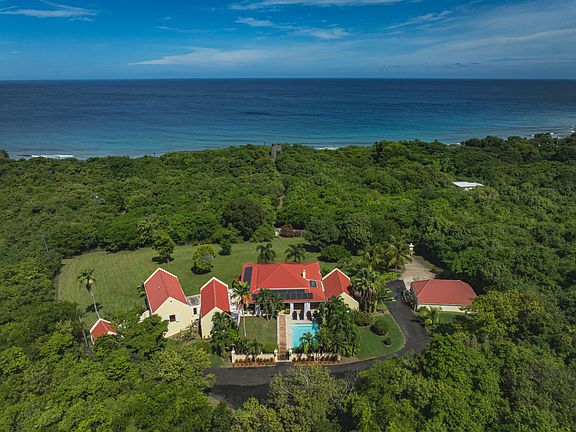 Estate Lucky Bottom: A rare piece of history in Cane Bay, this extraordinary 17.88-acre estate features a stately Greathouse with a saltwater pool and sweeping Caribbean Sea views, blending historic preservation with modern island luxury. The 4-bedroom, 4.5-bath residence, inspired by Danish colonial architecture, showcases Brazilian cherry and travertine floors, a solar power system with backup generator, and fine craftsmanship throughout. Behind the double gated entry--one at the road and another near the garage--beautifully landscaped grounds, with fruit trees, unfold across rolling hills, surrounding rare 1820 sugar-mill ruins with an intact animal slue--the only one of its kind on St. Croix. The grounds are abundant with mature specimen trees--mahogany, baobab, kapok, coconut palms, and fruiting varieties like guavaberry, banana, and Barbados cherrycreating a lush tropical landscape. The entire property is comprised of six separate parcels, offering complete control over privacy, access, and views across the estate. Ideally located near Cane Bay's beaches, diving, and dining, Estate Lucky Bottom offers timeless history, privacy, and sustainable island elegance.