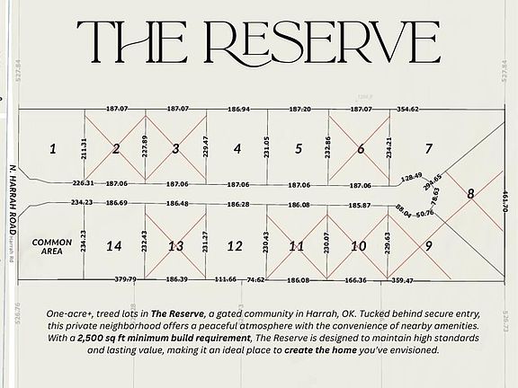 Discover the perfect setting for your dream home on this beautiful one-acre, treed lot in The Reserve, a gated community in Harrah, OK. Tucked behind secure entry, this private neighborhood offers a peaceful atmosphere with the convenience of nearby amenities. With a 2,500 sq ft minimum build requirement, The Reserve is designed to maintain high standards and lasting value, making it an ideal place to create the home you’ve envisioned.