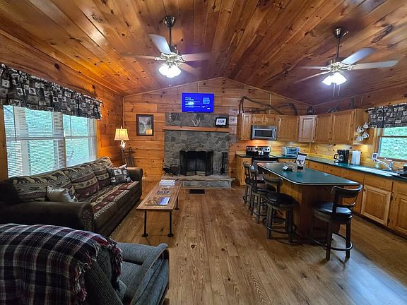 The open floor plan features a living room with a 43" smart TV, a rustic stone fireplace, Starlink internet, a fully stocked kitchen & island bar, a kitchen table, and a Queen sleeper sofa. Wood floors are featured throughout. The bedroom boasts a Queen bed, a 43" smart TV, & ceiling fan. Bathroom access from bedroom or living room, includes washer and dryer, & a 1-year-old Central Heating & AC unit featuring HEPA filtration. Utilities included!