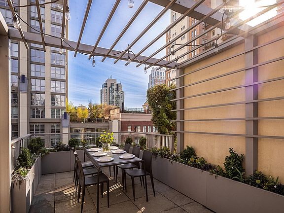 Custom impeccably chic townhome @The Eden, reimagined by Leckie Design Studio. Situated on one of Yaletown's most coveted streets, this fully renovated home comprises 2 bdrms, 2 bathrms, & den / 3rd brm. Boasting 632 sf of private outdoor, including rooftop garden & balconies off both bedrms. The upscale design includes a Bulthaup kitchen, PITT integrated cooktop, smoked oak millwork, dramatic double height living room ceiling, FLOS light fixture, Wolf/SubZero/Gaggenau appliances, & an architectural stairwell. The bathrms provide custom tiles, Brizo black fixtures, Duravit porcelains, & Nuheat. The rooftop terrace is designed for entertaining & includes a custom modern pergola, irrigated landscaping, & gas BBQ. A rare design offering in one of Vancouver's most desirable locations.